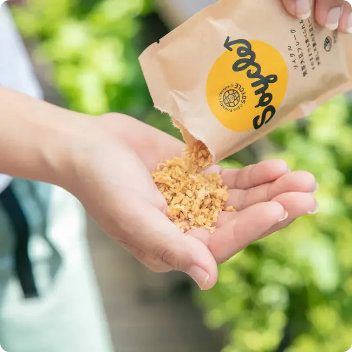 Soycleは、たんぱく質が豊富で、さまざまな食事にふりかけるだけで使える、新しい食材です。それと同時に、環境にもやさしいサステナブルな食材でもあります。
